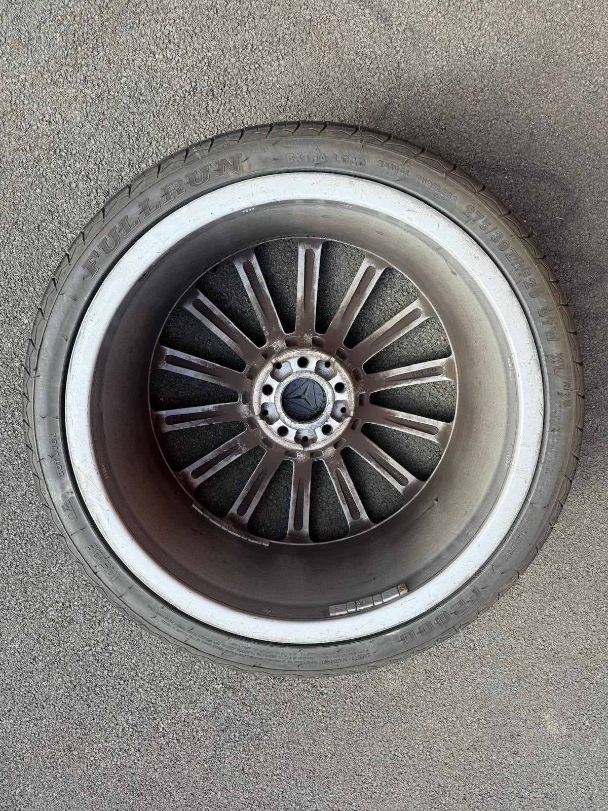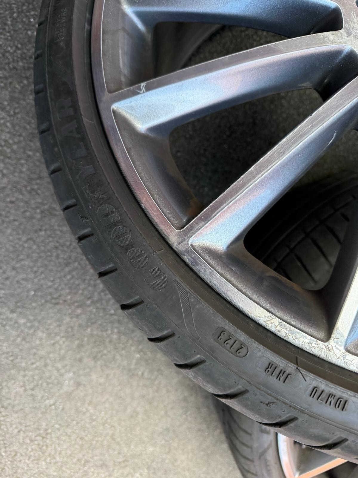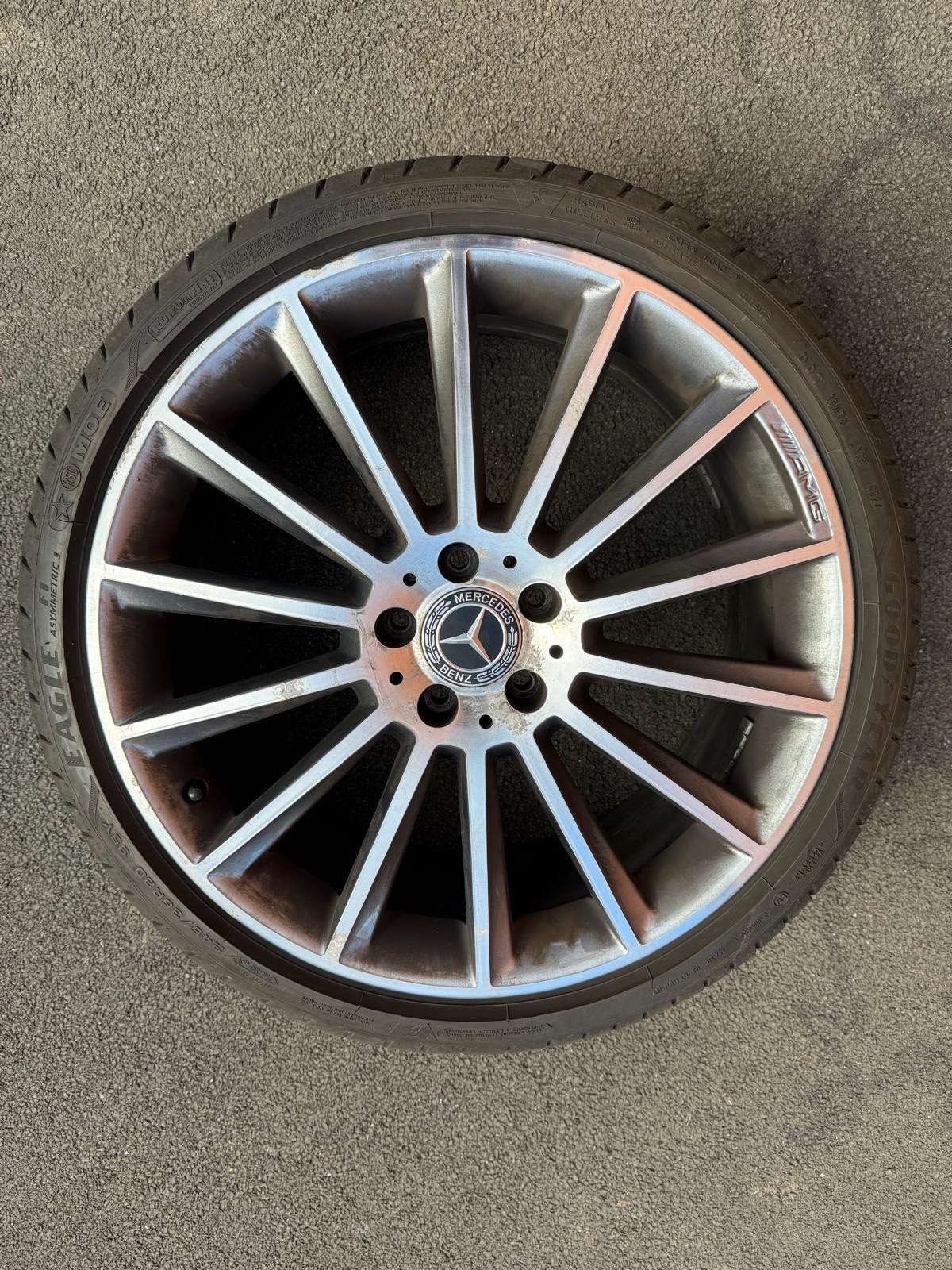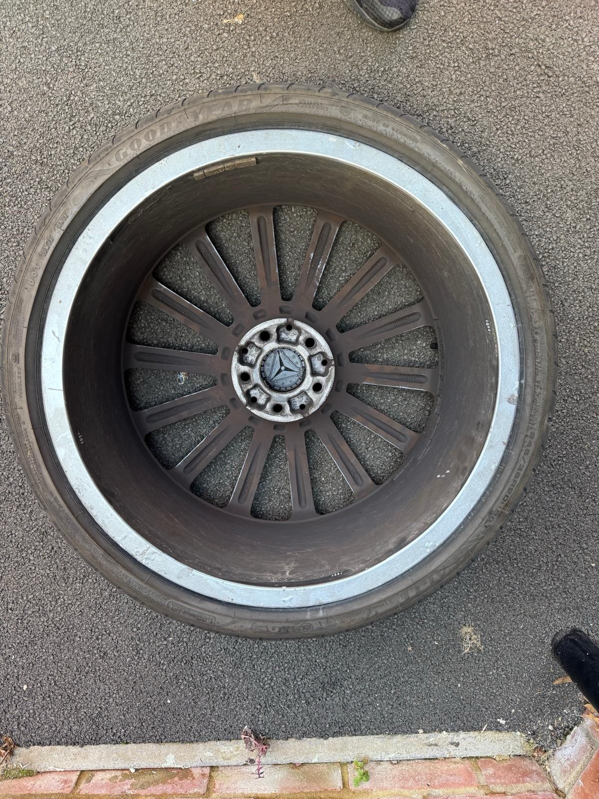 Original turbine AMG Mercedes 20 inch; Front – Good Year – 245/35R20 95Y – 2024 – 6mm Rear – Budget Tyres (Kustone – 8mm and Full run – 6mm) 275/30R20 – one at 2023 and other at 2024